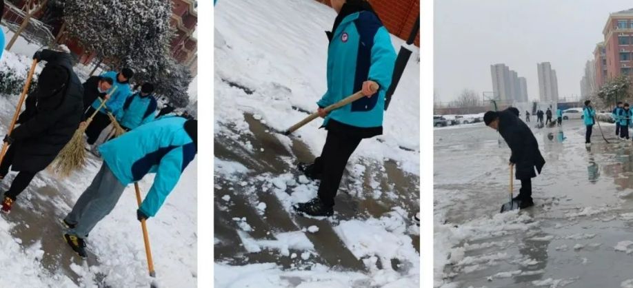为尽快扫除冰雪,保障校园道路畅通,消除安全隐患,次日一早,我校老师以及学生会同学们纷纷响应,迅速集结,积极迅速投入清雪除冰行动中。大家齐心协力、分工配合、有条不紊,推、铲、扫、堆,清除校园积雪和暗冰,用热情融化着冰雪,用爱心温暖着人心,奋力清扫出师生出行安全通道。