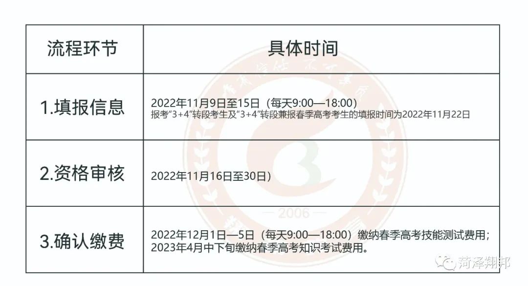 日前,山东省教育招生考试院发布了《关于做好山东省2023年普通高等学校招生考试报名工作的通知》。提醒考生,2023年高考报名将于11月9日-15日(每天9:00-18:00)进行。现对其中的春季高考报名办法解读如下: