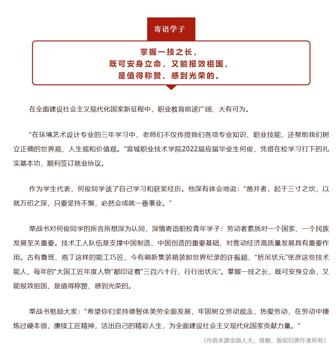 栗战书强调,要全面贯彻习近平总书记关于职业教育的重要指示要求,把党中央关于职业教育改革发展的政策举措和实践中的成功经验,通过法定程序转化为法律规范,推动解决职业教育中的热点难点和突出问题,为培养更多的高素质劳动者和技术技能人才,打造现代职业教育体系夯实法治基础,真正让职业教育“香起来”“热起来”,让更多青年都有人生出彩的机会。